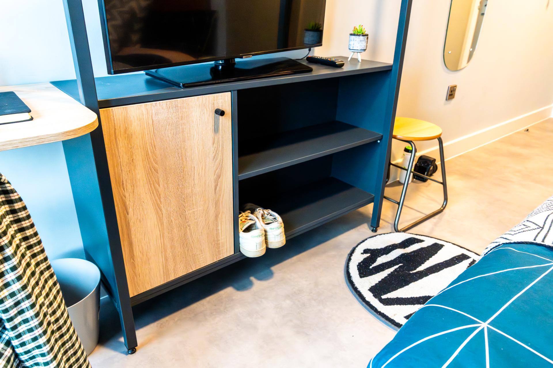 Our 12.4m² Classic en-suite rooms feature a comfortable bed, a large study desk, and an open clothes rail. Featuring large windows overlooking the courtyard, air conditioning, and high-speed Wi-Fi make this space both comfortable and functional. You’ll also have access to a communal kitchen and living space where you can socialise with your flatmates. These living spaces are shared by 9, 10, or 11 other people. Beyond your room, take advantage of Guilden Village’s amenities, which include a gym, a cinema room, and social study areas.