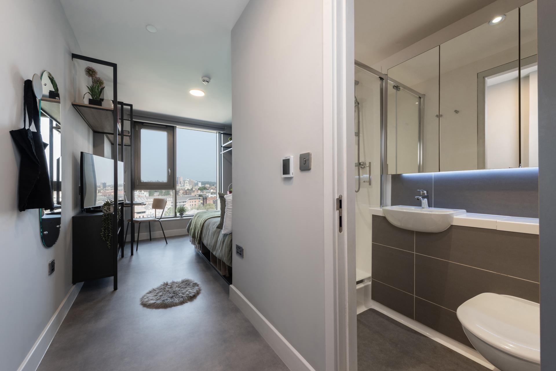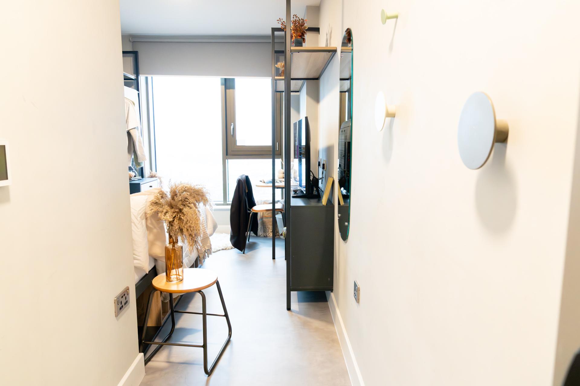 Our Classic en-suite rooms, located on floors 1-4, provide an excellent balance of privacy and social living. These rooms offer 12.3-13.7m² of space, a comfortable double bed, a study area with a desk and chair, and ample storage, including a secure safe. Air conditioning keeps you comfortable all year, and your own television allows you to relax. The en-suite bathroom is convenient, and the shared kitchen, which is regularly cleaned, is a great place to cook, eat and bond with other students.