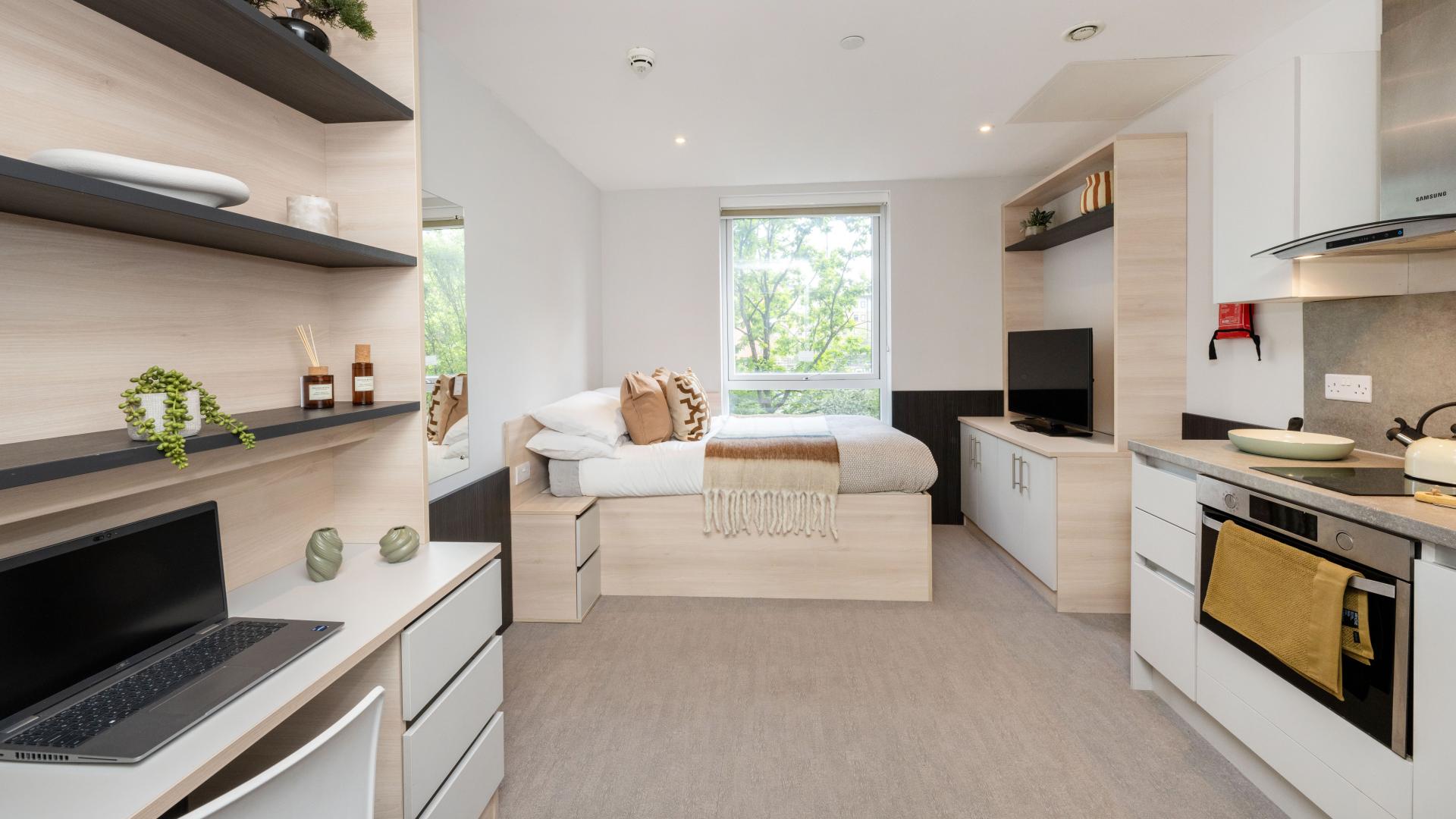 Choose from fully furnished en-suite rooms or private studios, each designed for comfort and practicality. You’ll have air conditioning, a Samsung Smart TV, and high-speed Wi-Fi, making it easy to study, relax, or keep in touch.