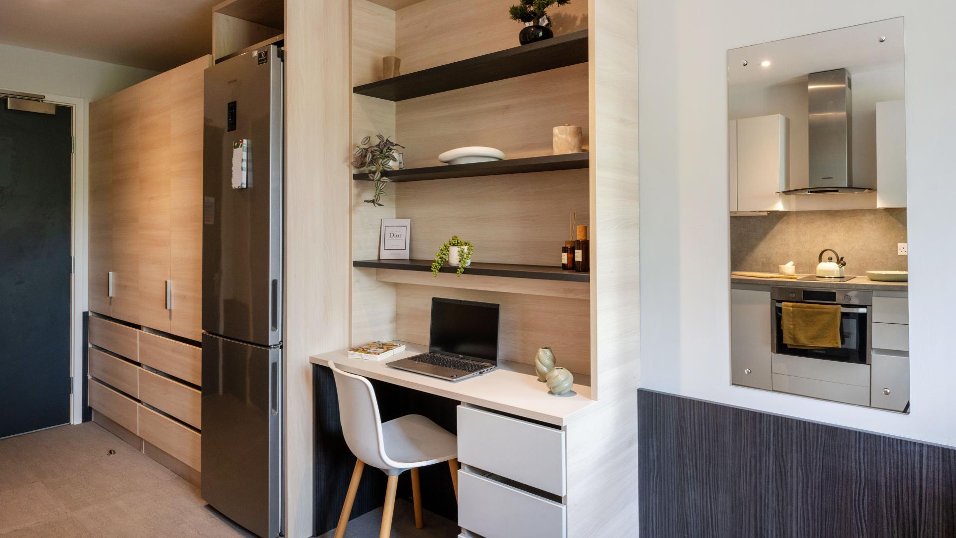 Our stylish and thoughtfully designed Classic Plus Studio, located on the 5th floor and sizing around 19.4 – 21.4m², offers a perfect mix of comfort and privacy. With a cosy bed, a dedicated study area, and plenty of storage space, it’s ideal for both work and rest. The private kitchen lets you enjoy home-cooked meals, and the ensuite washroom adds convenience. A 40” Samsung Smart TV with Chromecast keeps you entertained, while air conditioning ensures comfort all year round. Secure fob access and the quiet top-floor location offer added peace of mind.