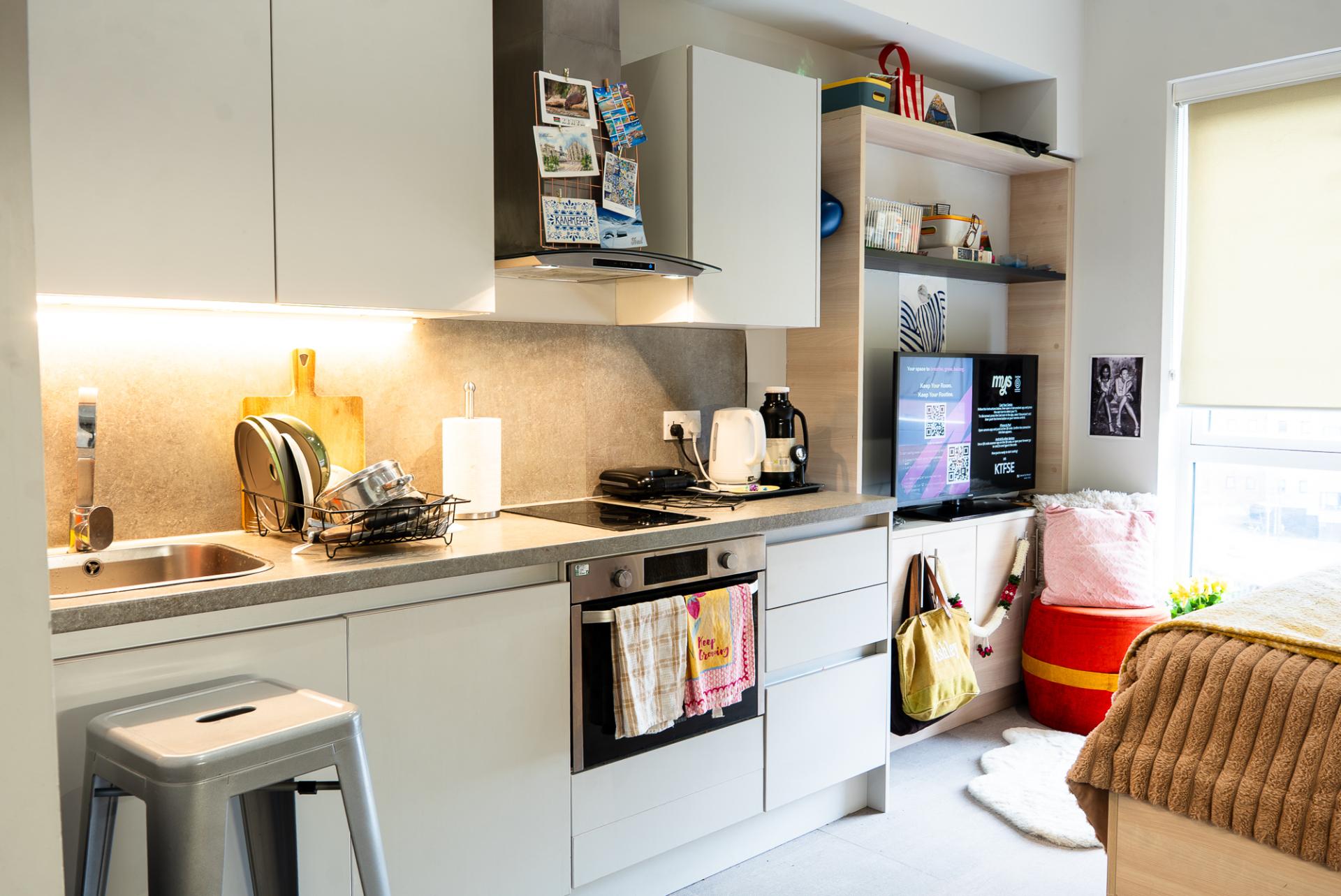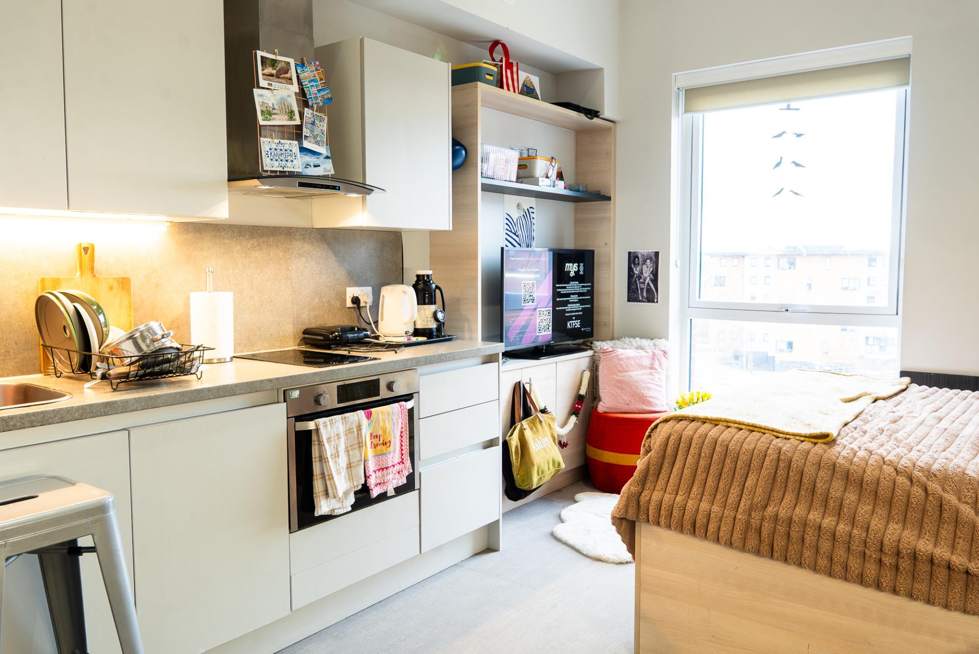 Choose from fully furnished en-suite rooms or private studios, each designed for comfort and practicality. You’ll have air conditioning, a Samsung Smart TV, and high-speed Wi-Fi, making it easy to study, relax, or keep in touch.