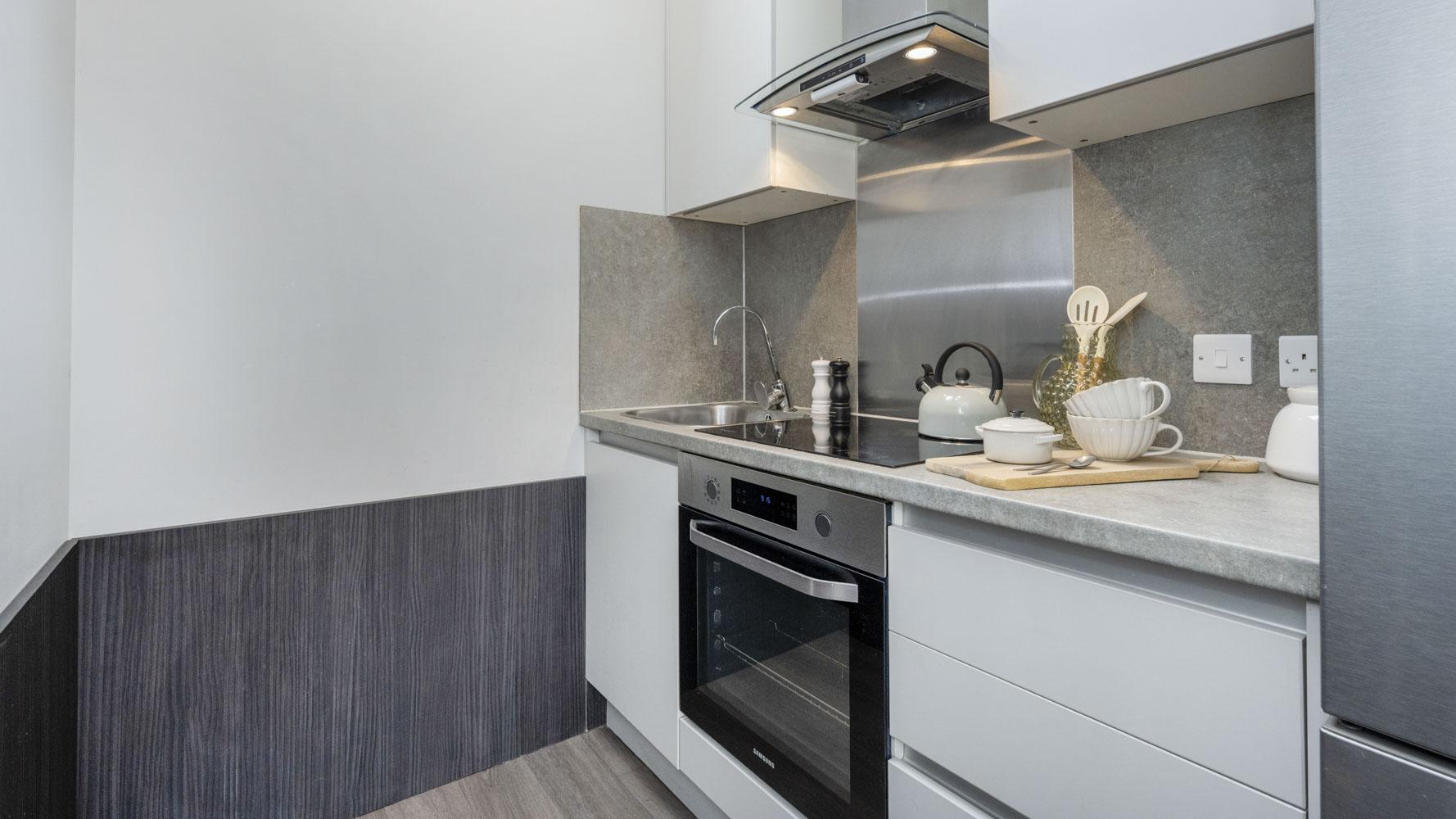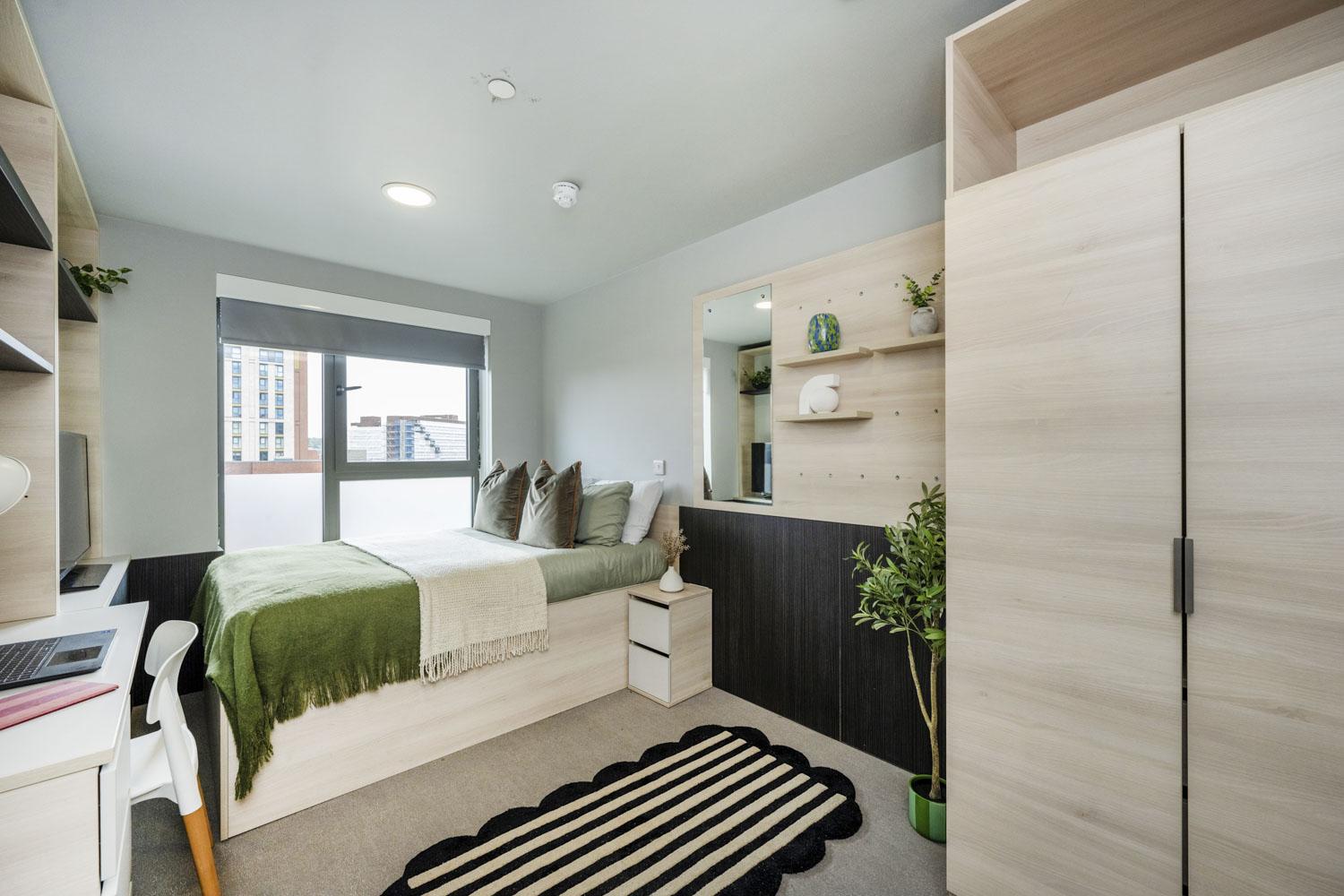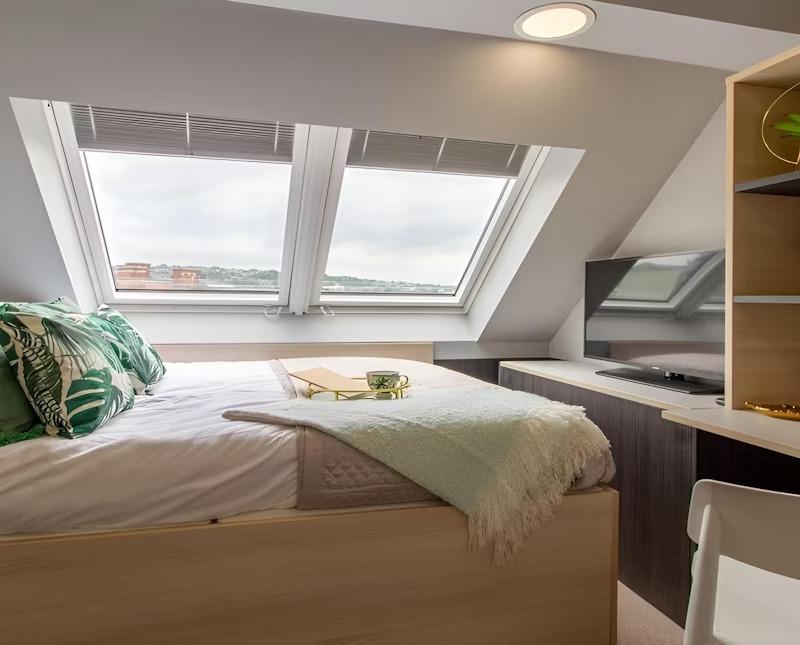 The Duplex Apartments have a spacious two-story design with plenty of room for both relaxation and study. The one-bedroom flat has a comfortable 3/4 bed, a designated study area and plenty of storage, making it ideal for students who require more space. The private en-suite bathroom offers convenience and privacy, while the kitchen gives you complete freedom to prepare meals whenever you want. These apartments are located on the fourth floor of the building and have stunning views of the Sheffield hills. Whether you want to relax in the open living area or retreat to your quiet study space, this flat provides the perfect balance of comfort and functionality.