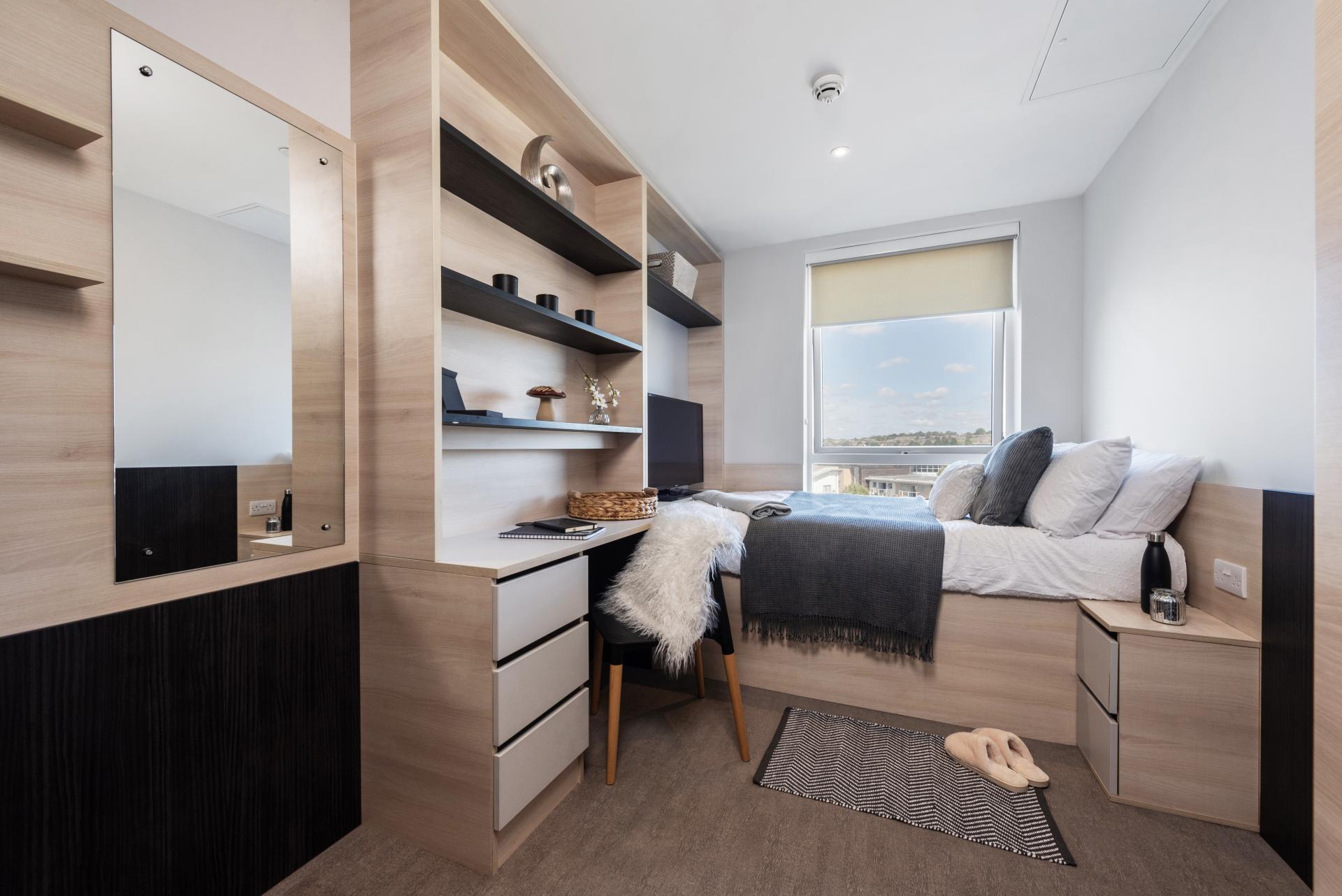 Our Premium en-suite, measuring approximately 14.8m², provides the ideal balance of comfort and practicality. The comfortable bed, large study area, and ample storage keep everything organised and accessible. The private bathroom provides privacy, and the 40″ Samsung Smart TV allows you to unwind with your favourite shows. For added convenience, the shared kitchen has everything you need for easy meal preparation. The air conditioning ensures year-round comfort, while the secure fob access and safety deposit box provide peace of mind. Each premium en-suite comes in a 9 or 10-bedroom flat configuration.