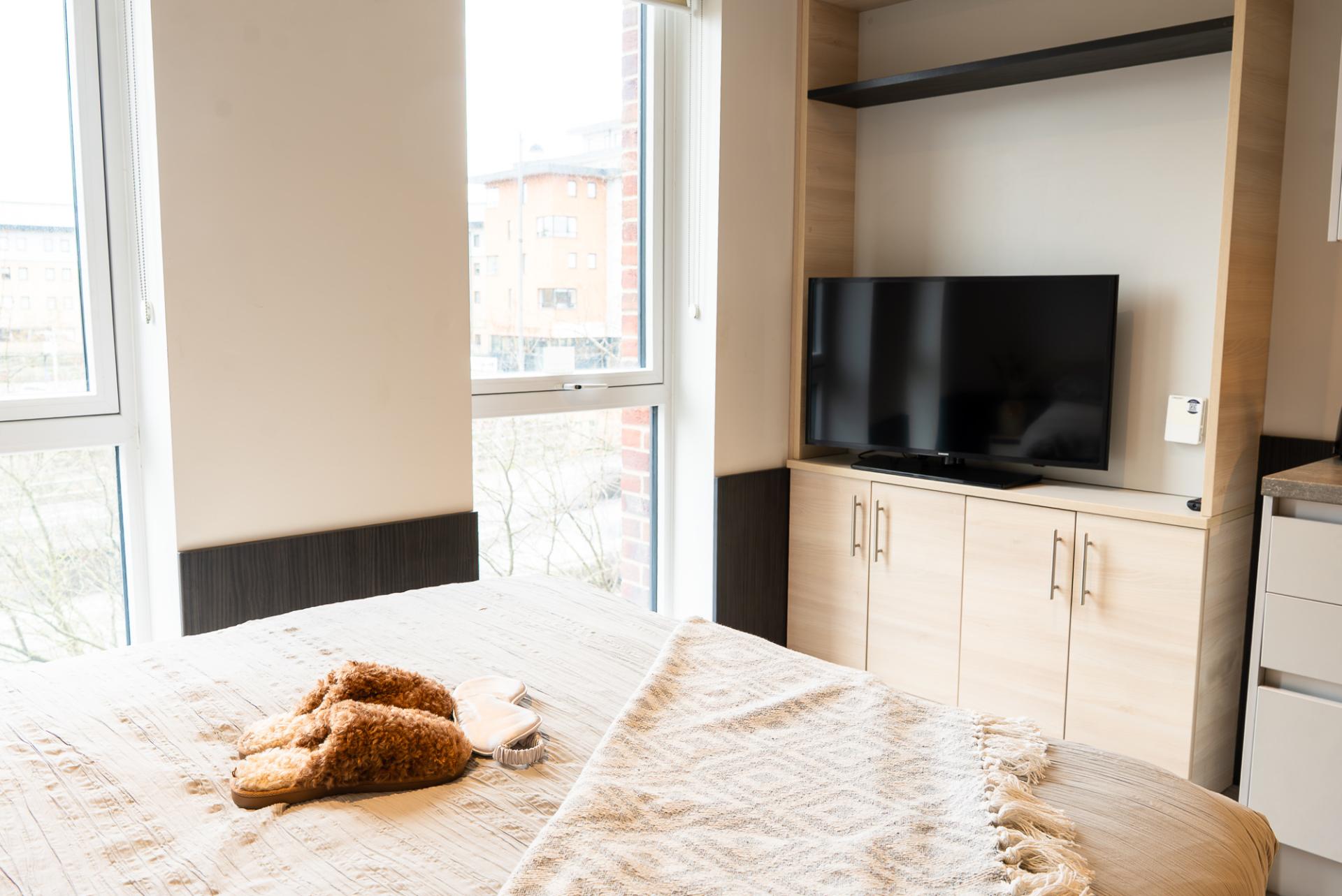 Our Premium Studio, which measures approximately 23m² , is intended for students who value both space and style. Enjoy a comfortable bed, a spacious study area, and plenty of storage for your personal belongings. The private kitchen allows you to cook with ease, and the ensuite bathroom provides complete privacy. Relax with the 40-inch Samsung Smart TV and stay cool with air conditioning. The secure fob access and in-room safe provide additional peace of mind.