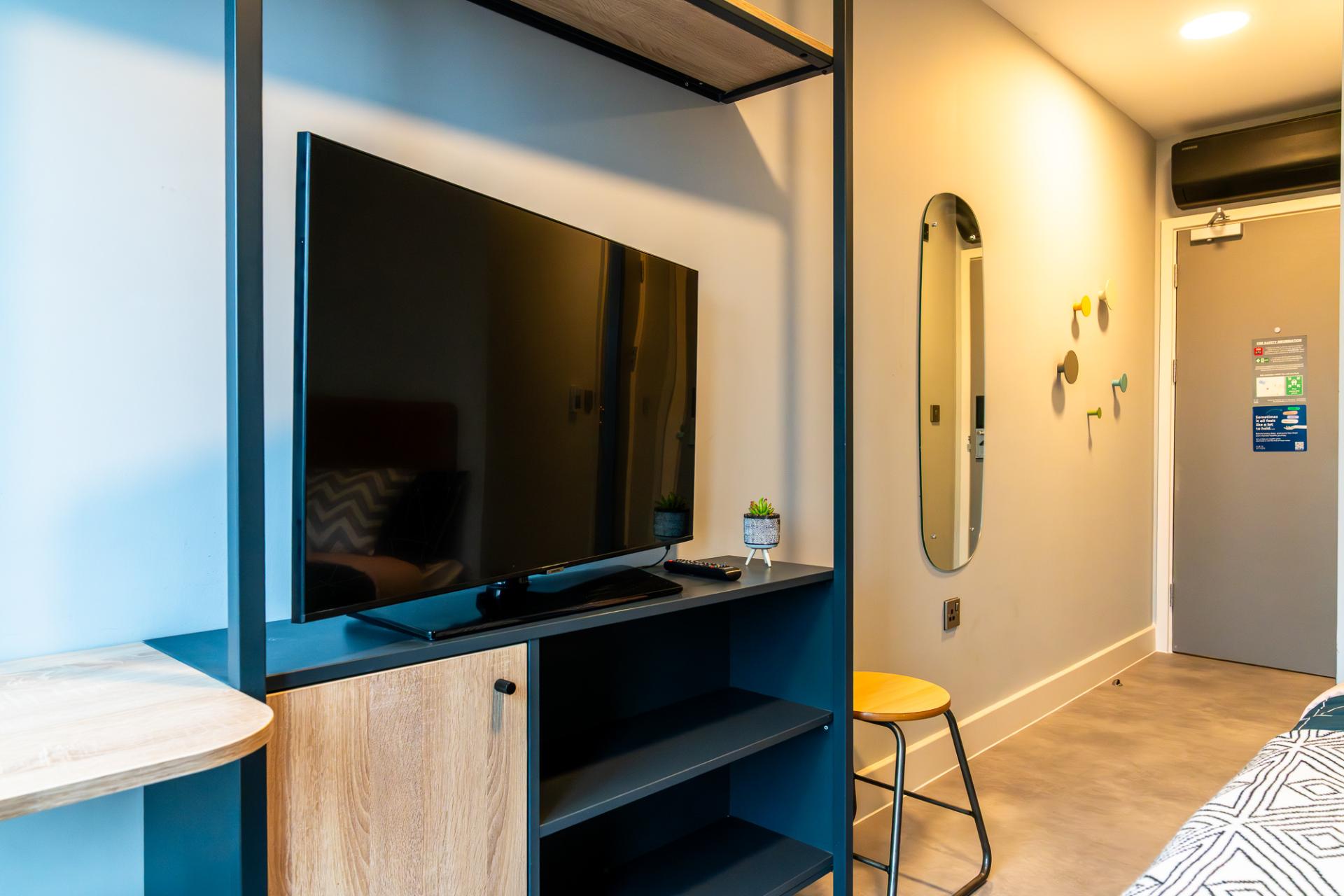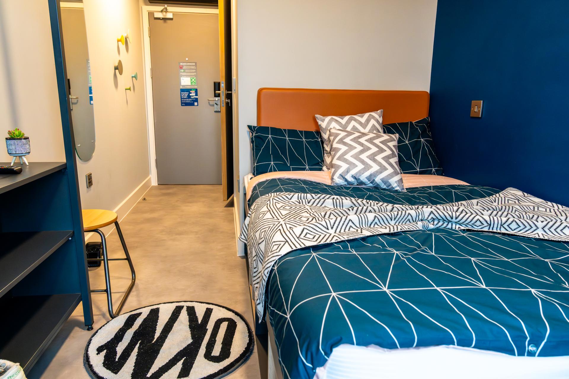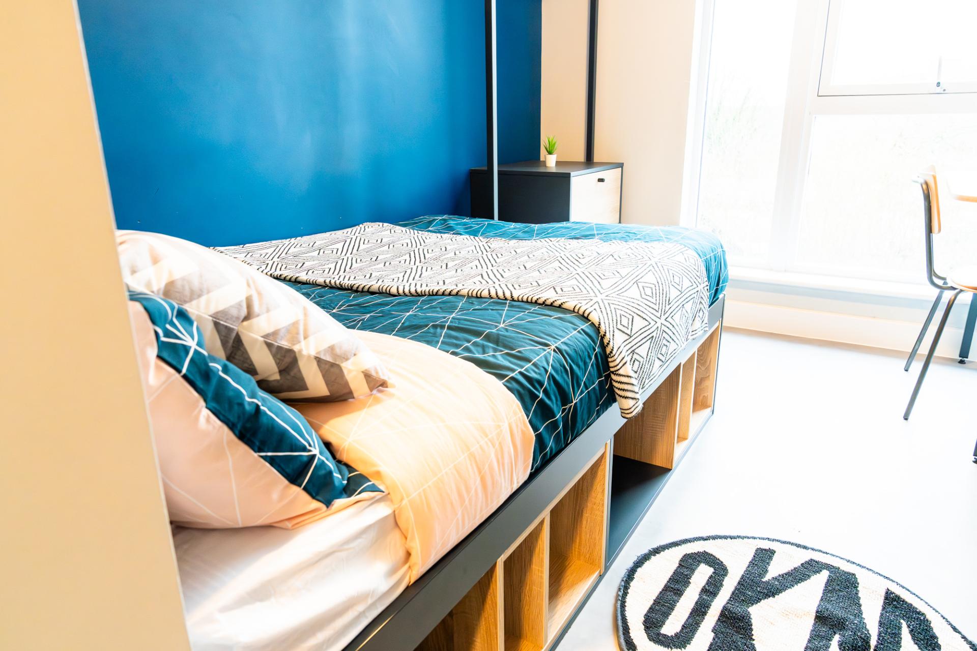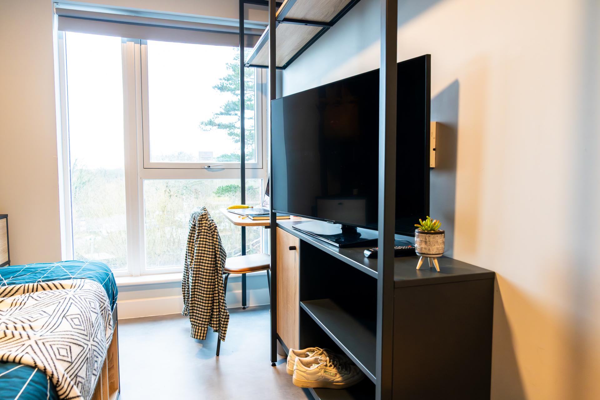 Our Classic Ensuite rooms in a four-bed cluster measure 12.4m² and include a small double bed with underbed storage, an open clothes rail, a USB plug next to the bed for streaming your favourite films and TV shows on your own Samsung 43-inch TV, a private ensuite bathroom and a shared kitchen area. You’ll have plenty of space with a breakfast bar and comfortable seating, as well as first-class social spaces such as our buzzing common room, a central landscaped garden, a sky lounge and many other options.