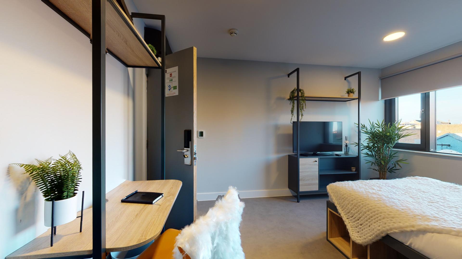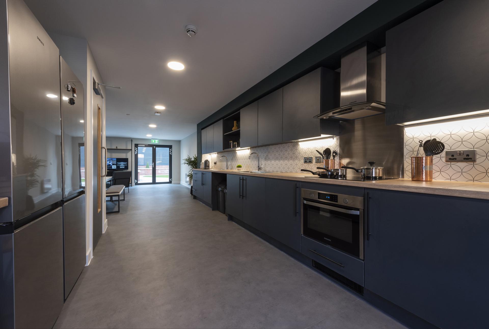 Our Townhouse Room Plus provides a lively and social living environment, with 8 bedrooms spread across two floors, four on each, and sharing two bathrooms. The floors feature a large kitchen, dining, and living area, ideal for relaxing or socialising. Each private bedroom is designed to be both comfortable and convenient, with room sizes ranging from 12-17.2m². You’ll have a double bed, a television, air conditioning, and a personal safe, as well as plenty of storage to keep your room light and uncluttered. The modern, stylish fittings provide the ideal backdrop for customising your room to your liking. Your dedicated workspace, complete with a desk and chair, provides a productive environment for focused study sessions. The shared kitchen is professionally cleaned on a regular basis, making communal living more convenient.