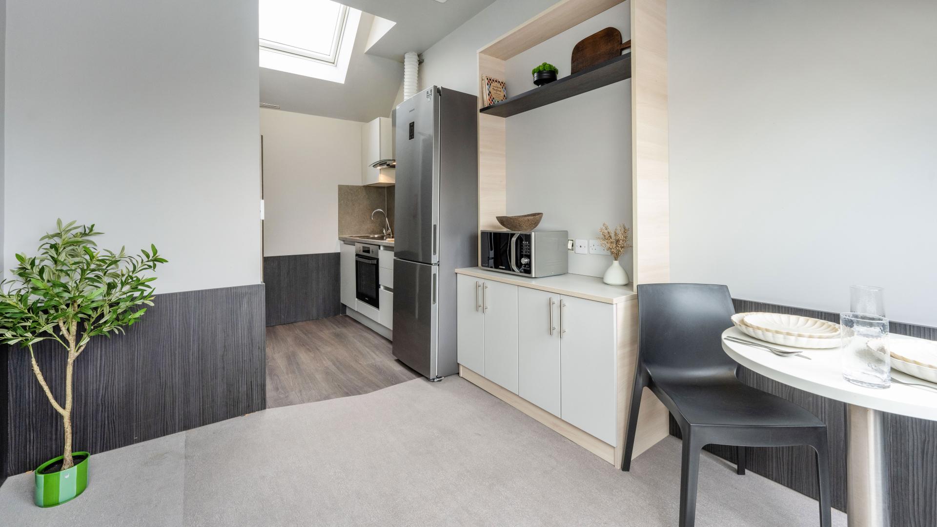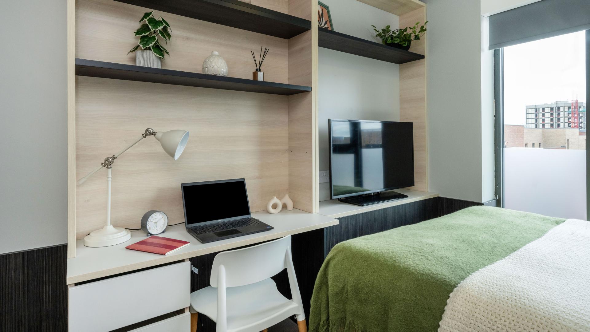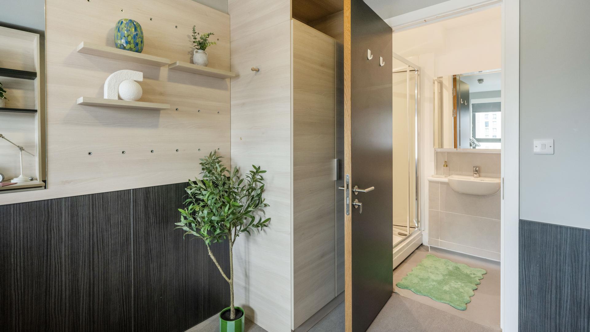 Our Two Bed Apartment provides the ideal balance of communal living and personal space. Each room has a comfortable 3/4 bed, a study area, and ample storage. Each resident has their own en-suite bathroom in the apartment, as well as access to a shared kitchen for meal preparation. This flat is ideal for students who want to share a living space but maintain their privacy and independence. These apartments are on the fourth floor of the building, with spectacular views of the Sheffield hills.