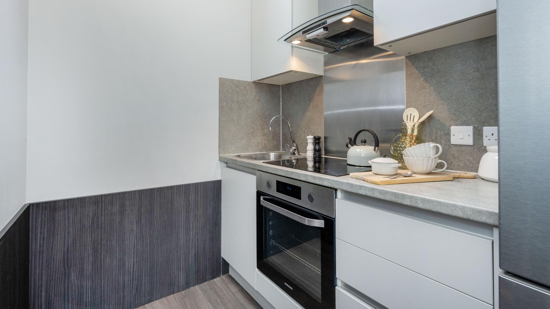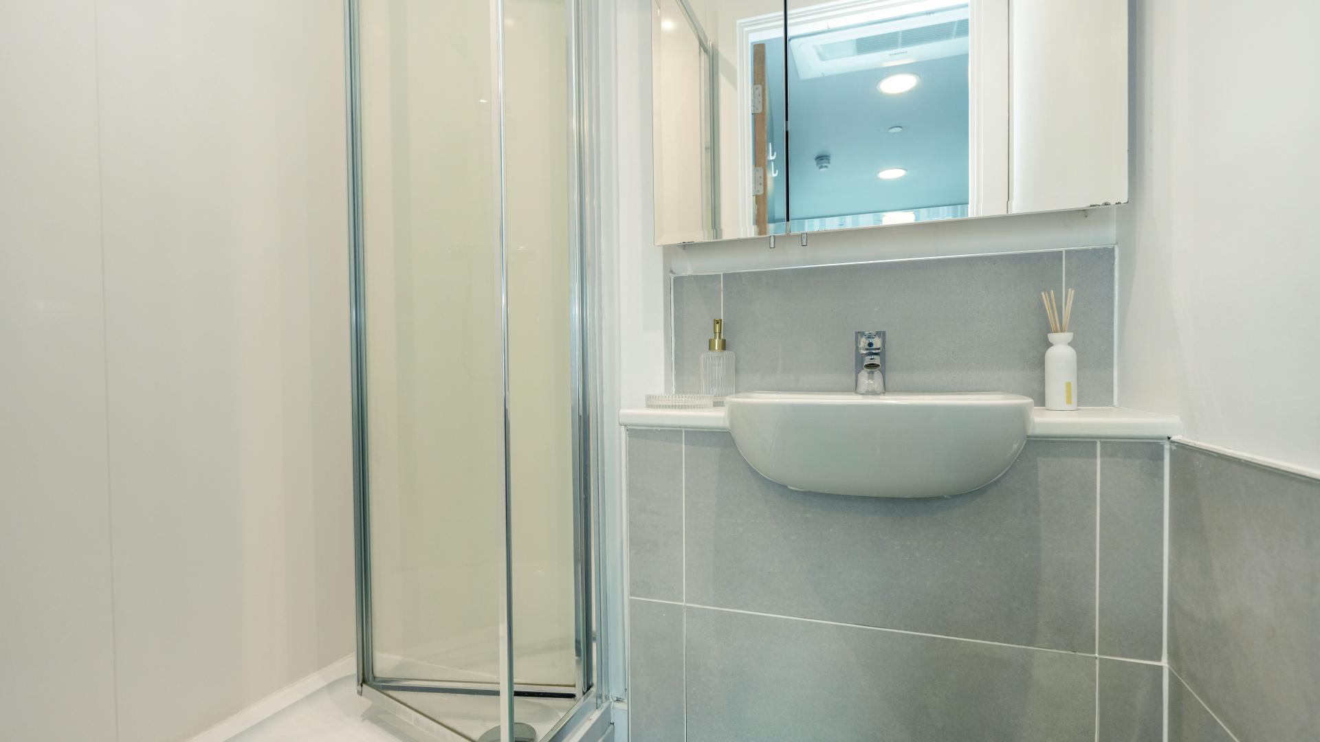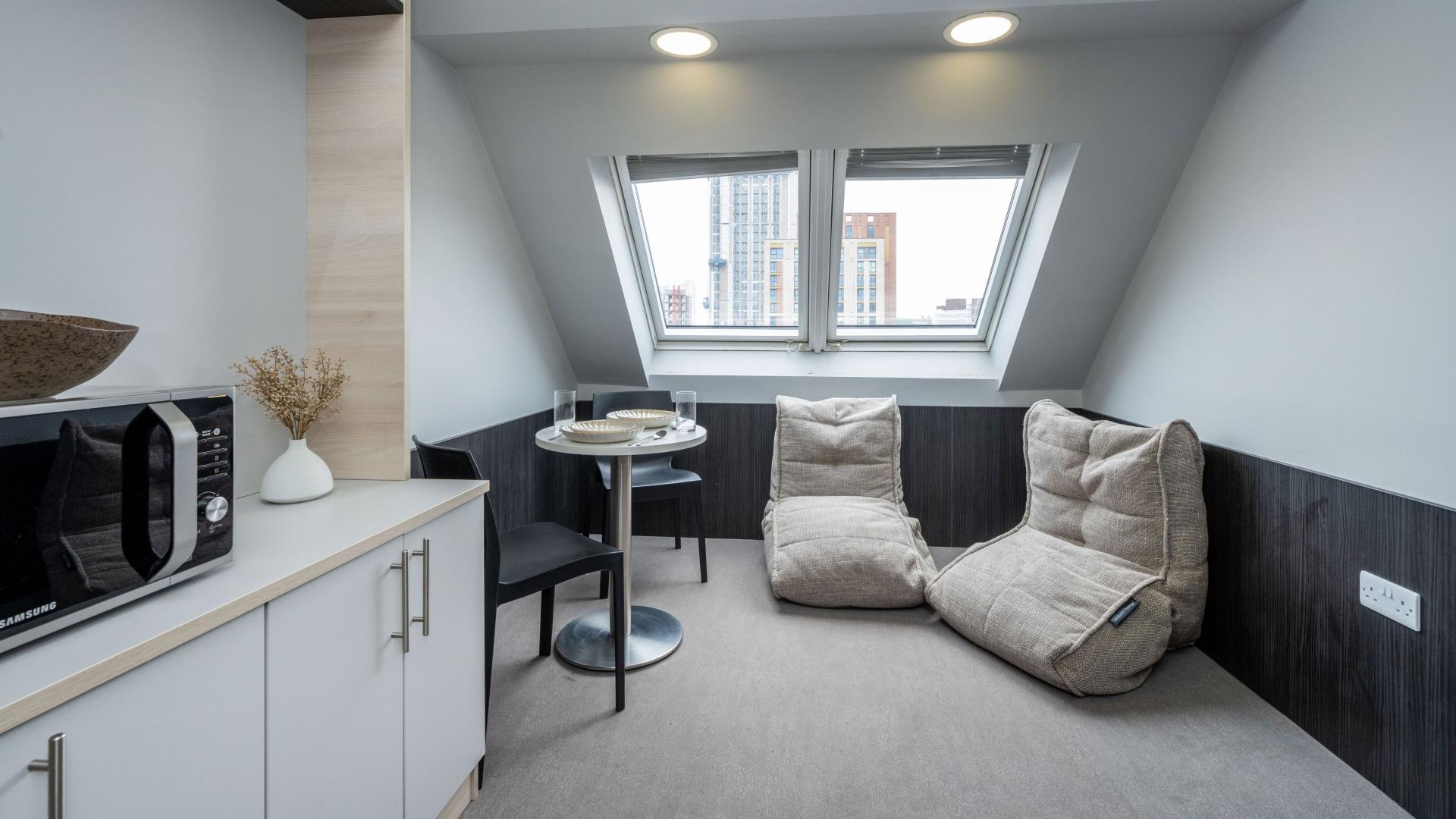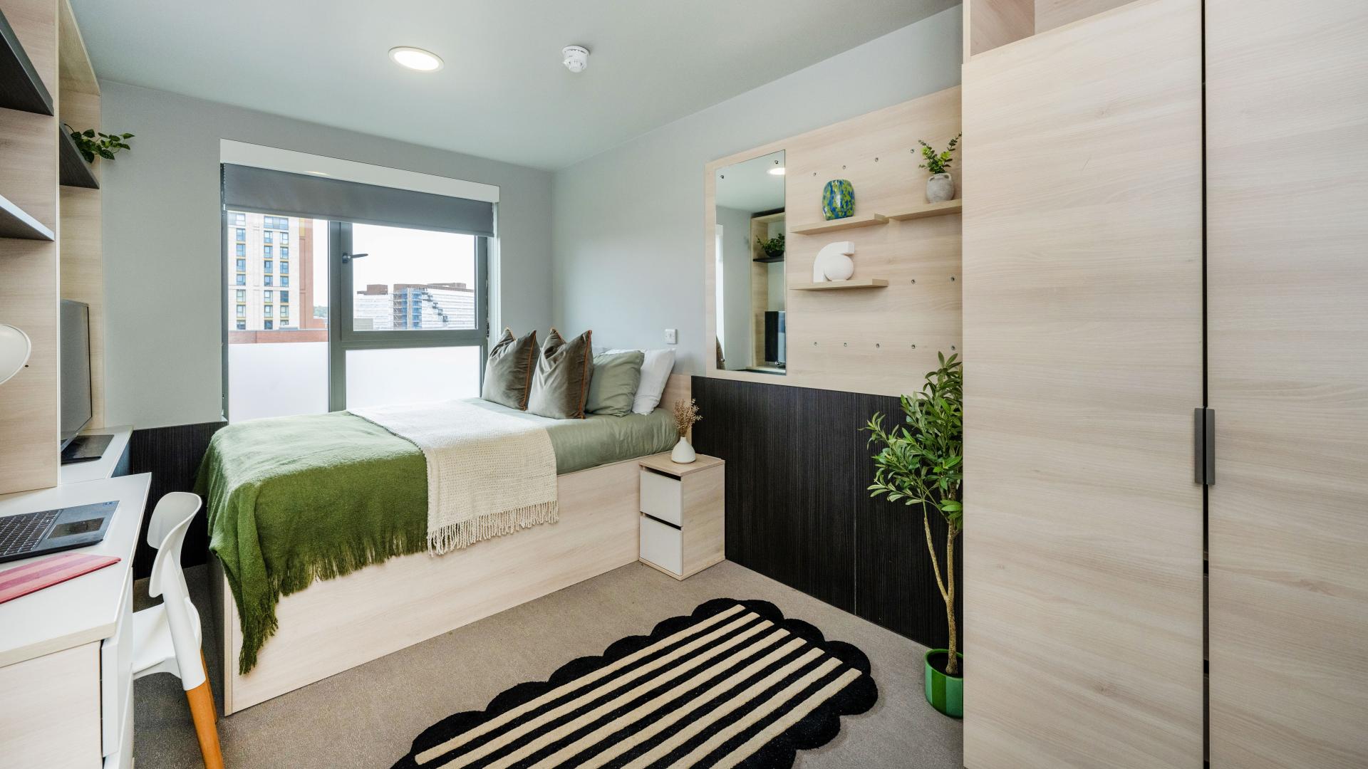 Our Two Bed Apartment provides the ideal balance of communal living and personal space. Each room has a comfortable 3/4 bed, a study area, and ample storage. Each resident has their own en-suite bathroom in the apartment, as well as access to a shared kitchen for meal preparation. This flat is ideal for students who want to share a living space but maintain their privacy and independence. These apartments are on the fourth floor of the building, with spectacular views of the Sheffield hills.